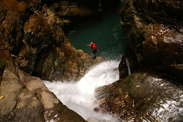 同行的每一個人都會游泳,即使第一次溯溪的小楊,也是輕易的就游過了這個深潭了。深潭盡頭有一座小瀑布,據說在以前是一座滿大的瀑布喔!龍王颱風後地形才改變的。但這改變是減低了難度啦,輕鬆攀上後就來到第二深潭了。這時就可以看到其他隊的人了,他們在第二道瀑布上方,正要往這邊下來。我們等了好久,終於等到可以過去的機會了。在這邊說明一下,第二深潭的盡頭又是一座瀑布,由於地形的關係必須連續接著上去,瀑布下方僅可容兩三個人站立,而且不穩定,若此時有人不敢過去而拖拖拉拉的話,便會有『塞車』這種事發生。 而我們目前就是遇到這種情形。好不容易等到交通有點順暢的縫隙,我們終於全員踏上第二瀑布上方了,回頭望去,正好趕上最後一束陽光撒進峽谷中的水潭,山壁一閃一閃的發亮。有幸遇到此刻,我趕緊拿出相機來,也顧不得岩石路面濕滑,加以塞車的人眾多,倚著大石頭匆匆的隨便拍了幾張照片。不一會兒,陽光的角度就推移到山壁後面,然後再也看不到泛著金黃色波光的峽谷了。 在這裡還有一段小插曲,小楊在攀爬第二道瀑布之前,由於岩石溼轆,不慎滑落到一旁的深潭中,這時,宗運見狀就跳下去……結果,兩個人的眼鏡就同時不見了!好在宗運還有蛙鏡,而小楊度數不深,因此我們還是可以順利前進。在這同時,我們也在瀑布上作無奈的等待。由於要下來的人太多,而且這班人大多是觀光客,他們也不太敢走,我和小孔、小賴皮只好非常無聊大眼瞪小眼的枯等,聊些言不及義的話題。總之,這段大概只要花十分鐘的路,我們走了快一小時。 好不容易等到人群都散去了,我們終於能游過第三深潭,沿第道三瀑布攀爬而上,終於能夠看到最終點,高約二十五米的大瀑布囉!真是謝天謝地。在這裡回頭望去由上望下俯瞰,可看到窄窄的峽谷石壁,呈現類似黃銅般的顏色。伸手去觸摸,才知道那是苔蘚類的顏色。推測應該是這裡瀑布水勢旺盛,空氣中佈滿水汽而使得峽谷內長滿這些黃銅色、銅鏽色的苔蘚。我想,在正午時拜訪這裡,應該更有黃金峽谷的感覺吧!這次遇到塞車太晚進來,我看只好等下次囉,希望是非假日的時候來!黃銅色的峽谷石壁