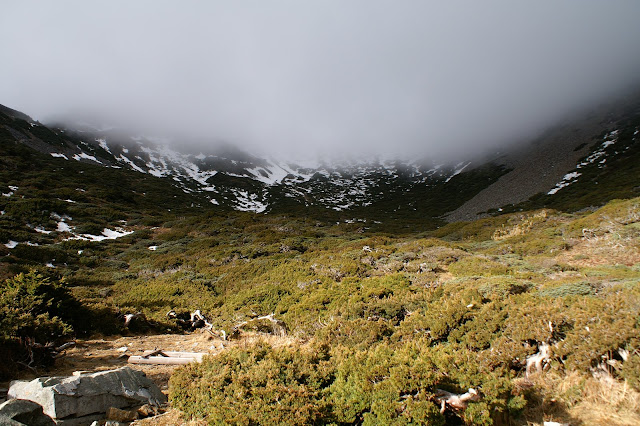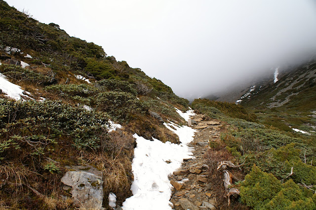走了一陣子,視野豁然開朗,圈谷終於要到了!!只可惜,眼前遠方似乎有一片濃厚的灰雲,看來今天看不道陽光照耀雪白圈谷的大景了。