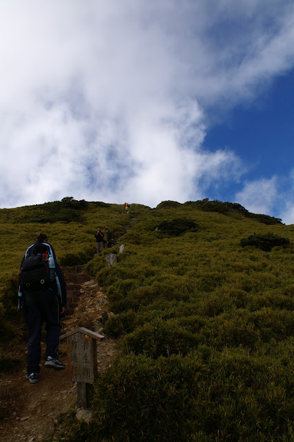 呵呵,接近山頂,眼前果然出現了成片的藍天!這天有好多人都上來合歡東峰。早上我們遇到的中大團,現在又遇到了,而且,他們在山頂拍求婚影片,超有趣的。